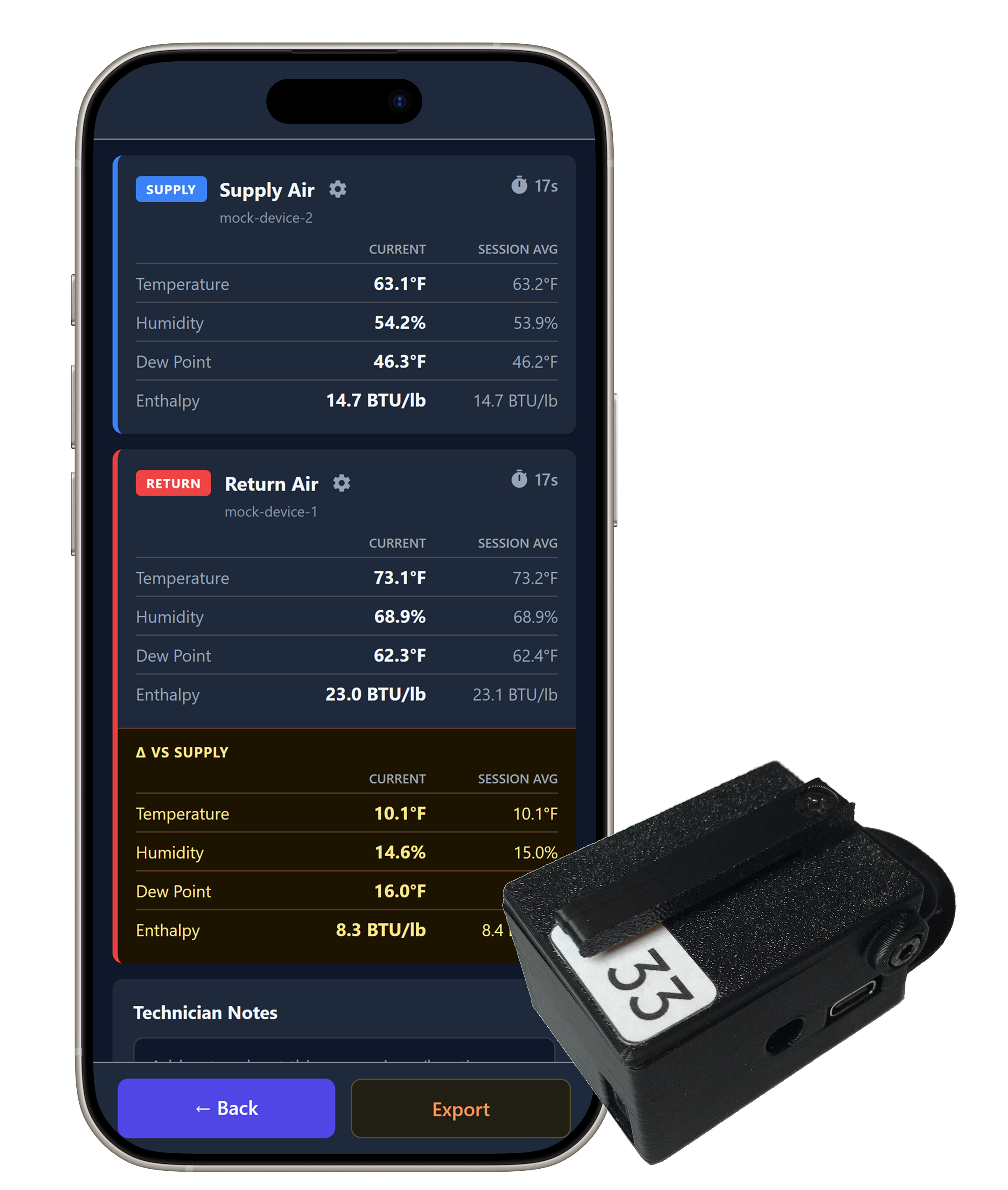 Bluetooth Temperature modules for HVAC technicians to quickly gauge system health. Covers temperature, humidity, dew point, and enthalpy.